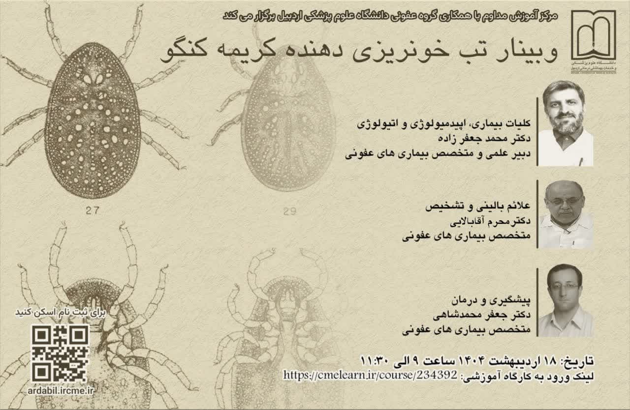 وبینار تب خونریزی دهنده کریمه کنگو با تدریس سه نفر از اساتید بالینی دانشگاه علوم پزشکی اردبیل.زمان: روز پنجشنبه مورخه 1404/02/18 ازساعت 9 الی 11:30